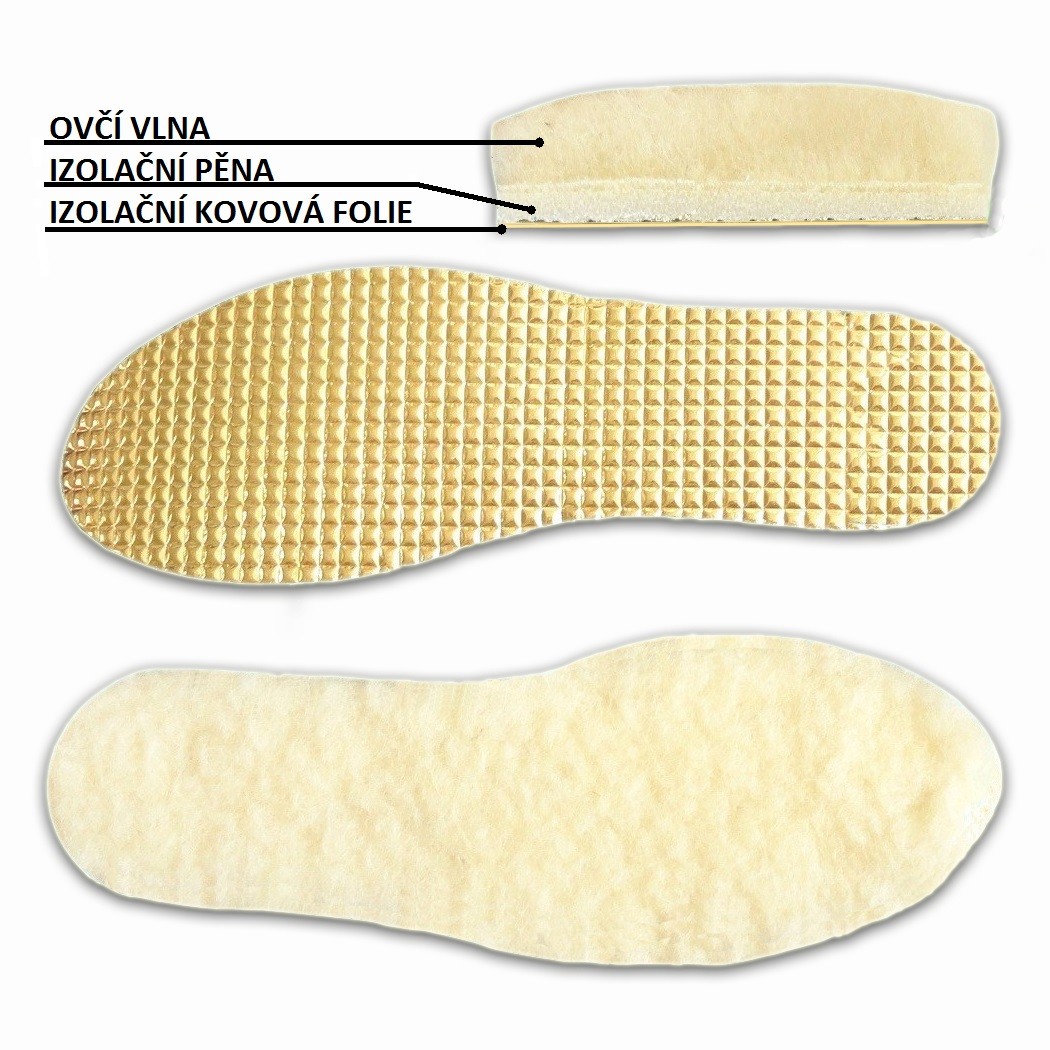 Vložky s ovčí vlnou a izolační zlatou termofólií proti promoknutí. Termo fólie násobí hřejivost stélek a teplotu vrací zpět do boty. Tyto stélky jsou velmi oblíbené i na léto. V létě chladí v zimě hřejou.